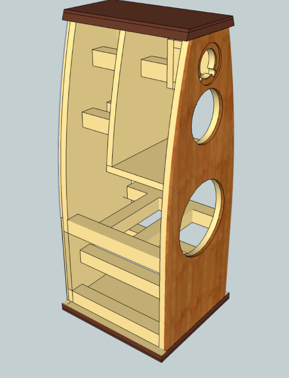I selected Peerless 12" drivers for the woofer, Peerless 6.25" drivers for the midrange and Vifa radial tweeters. My design put the woofer in a back-ported bass reflex cabinet, with the midrange and tweeter in separate sealed enclosures within the overall speaker cabinets.