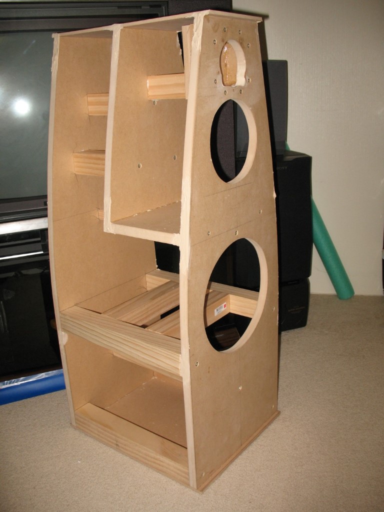 I made a second front baffle from 12mm plywood, to provide additional rigidity for the drivers, and stained it to give a more natural wood look. I then began construction of the internal framing and sealed internal enclosures.