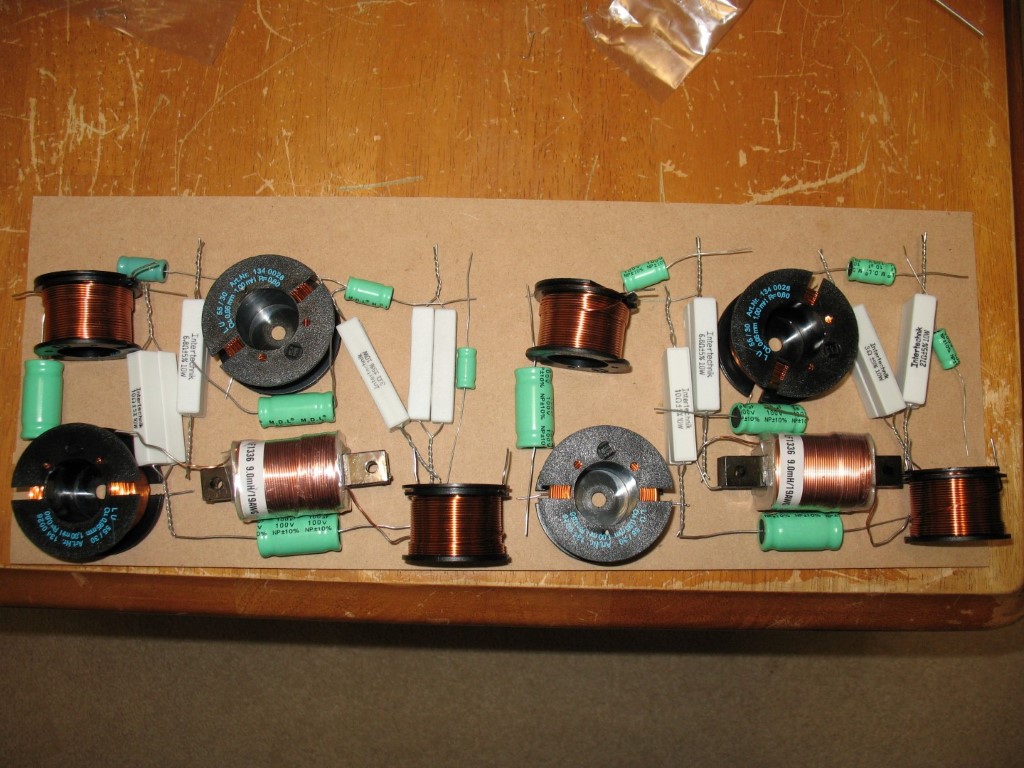 I laid out the crossover components on a piece of 5mm MDF. I then drilled holes and inserted some brass screws at the points where the component leads needed to be connected. I soldered lugs to the component and speaker leads, and used brass nuts to screw them together on the brass screws, to allow for easier replacing components if needed.
