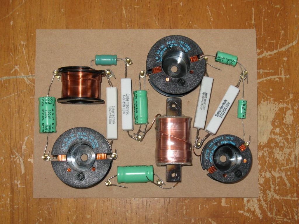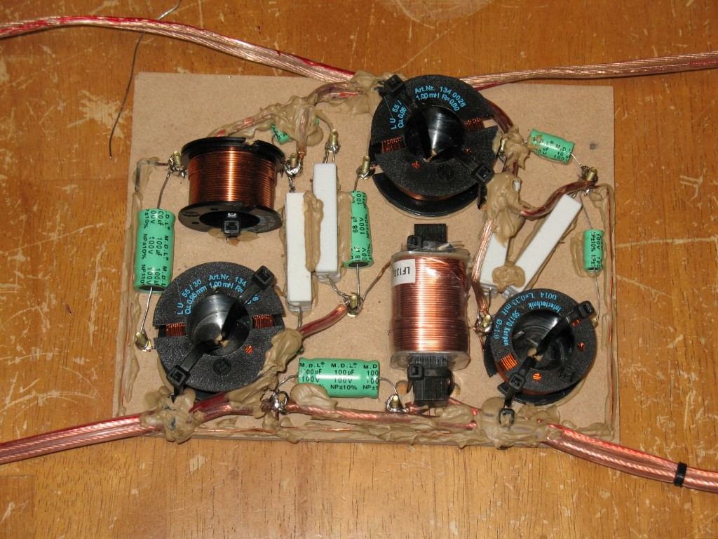 I glued the components down to help avoid them loosening from bass vibration. Then I wrapped the crossovers in foam to help reduce any microphonic interference. Not the neatest job, but it does the trick.