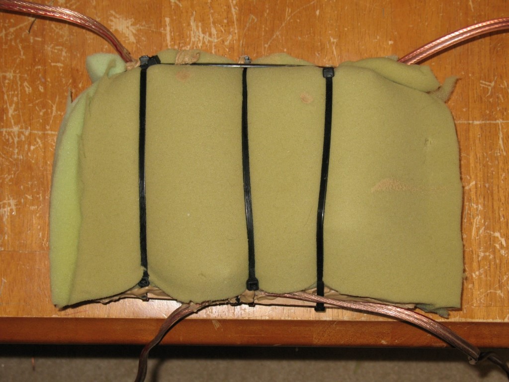 After sanding the front, back, top and bottom edges of the laminates flush, I lined the interior of the bass cabinets with some foam taken from an old mattress, to provide the required level of damping as per the enclosure modelling.